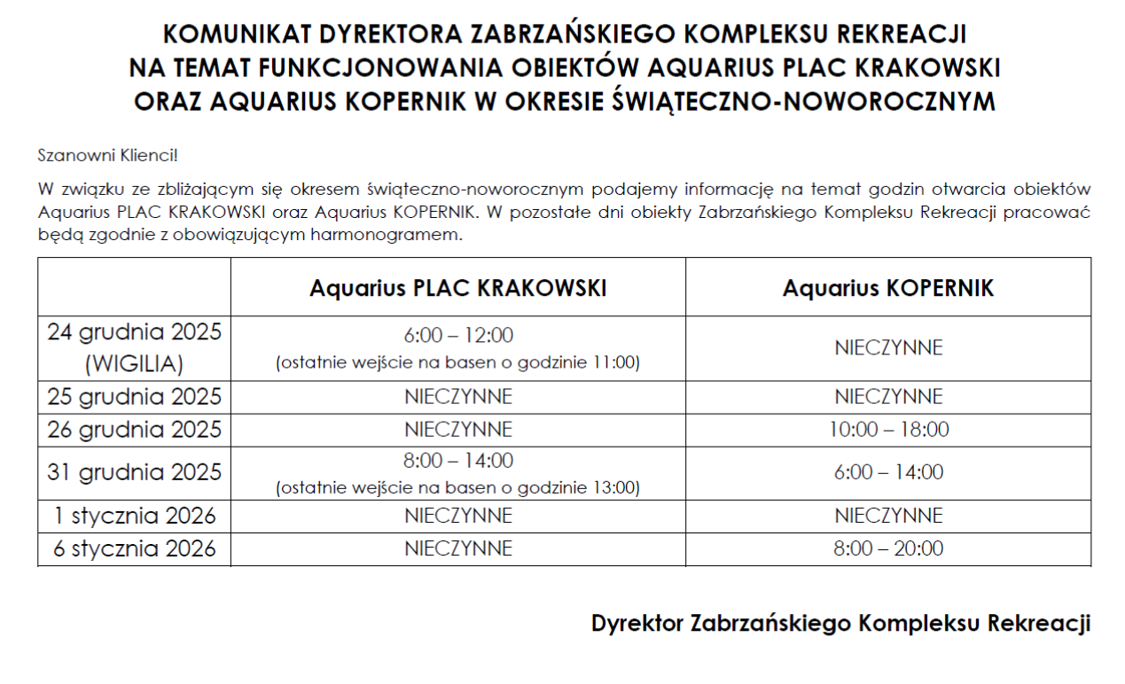Przedstawiamy godziny otwarcia obiektów Zabrzańskiego Kompleksu Rekreacji w okresie świąteczno-noworocznym > więcej